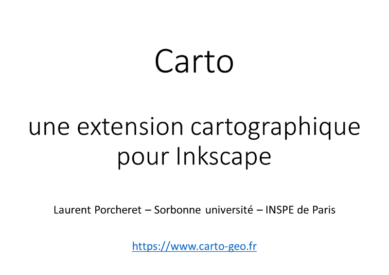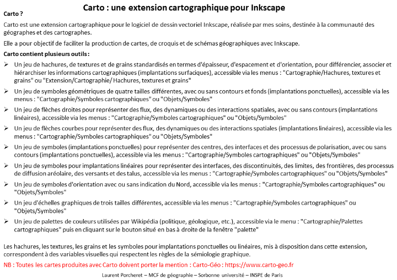 Carto est une extension cartographique pour le logiciel de dessin vectoriel Inkscape, réalisée par mes soins, destinée à la communauté des géographes et des cartographes.