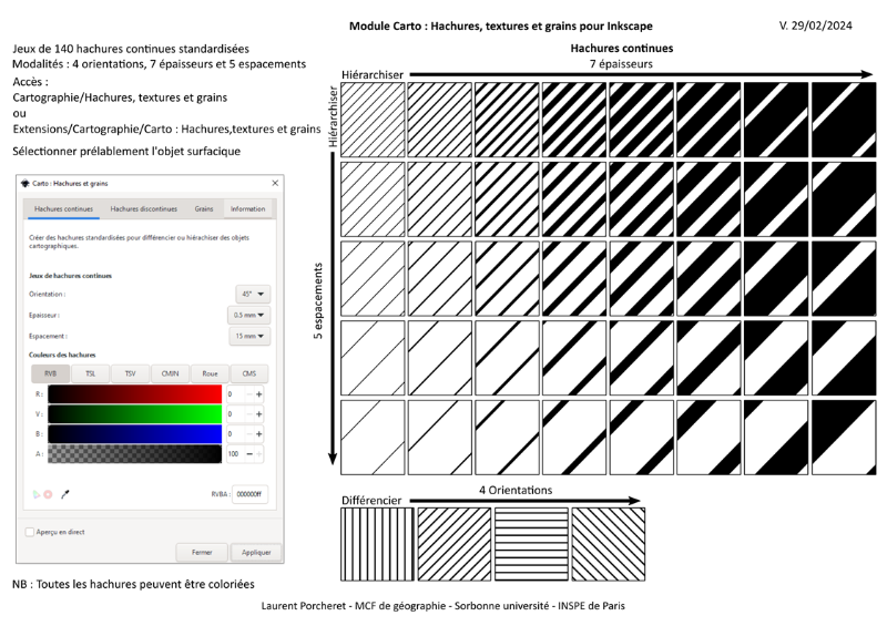 - Un jeu de hachures, de textures et de grains standardisés en termes d'épaisseur, d'espacement et d'orientation, pour différencier et hiérarchiser les informations cartographiques (implantations surfaciques ou ponctuelles), accessible via le menu : Extension/Cartographie
