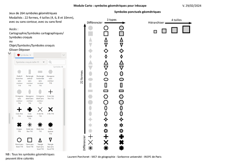 - Un jeu de symboles géométriques de quatre tailles différentes, avec ou sans contours et fonds (implantations ponctuelles), accessible via le menu : Objets/Symboles